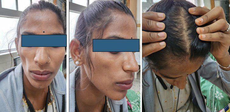 A 21-year-old female presented with a 4-year history of progressive alopecia localised to the right frontoparietal scalp, subsequently followed by cutaneous and subcutaneous atrophy in the same region. Two years later, she developed ipsilateral facial hemiatrophy, characterised by a gradual loss of volume and tissue wasting on the right side of her face. Notably, she remained free from neurological manifestations, including seizures and visual disturbances.