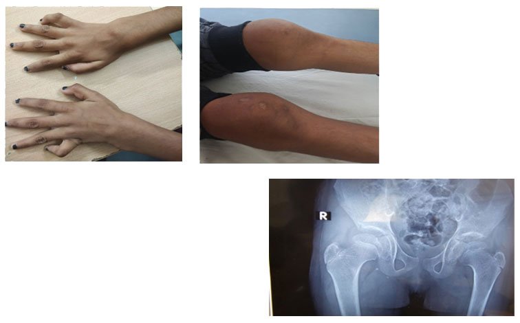 A 9-year-old girl, born of a consanguineous marriage, presented with progressive finger flexion deformities and swelling of wrists, knees, and ankles since age four. She was previously diagnosed with polyarticular JIA and treated with multiple DMARDs and biologics without response. Re-evaluation at our centre revealed non-inflammatory joint swelling, camptodactyly, restricted movements without tenderness, and radiologic coxa vara.